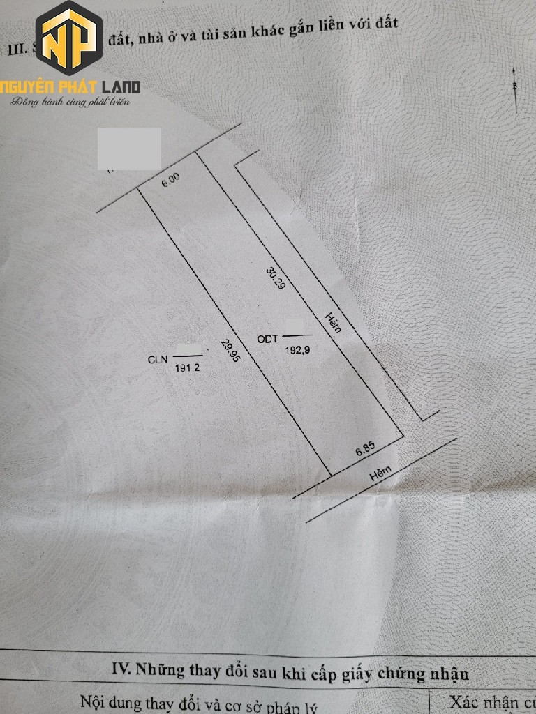 📐 Diện tích: 6.85 x 30 = 193 m2 ODT có hẻm thông hành 2m; Hướng: Đông Nam.